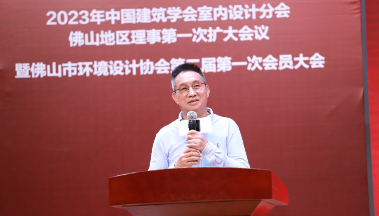 中国建筑学会室内设计分会副理事长、佛山市环境设计协会会长谢智明上台发言,并宣导中国建筑学会的精神,解读中国建筑学会-建筑工程类工程会员能力评价标准,分享多个国际设计大奖。他表示,作为佛山的设计师,要热爱这个城市、热爱这个行业,要担起推动行业、城市发展的责任。